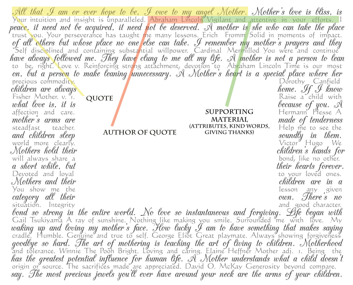 Timeless quotes about a Mother's love and strength form the base of this art. Then we weave together the authors' names and kind words to create a word tapestry.