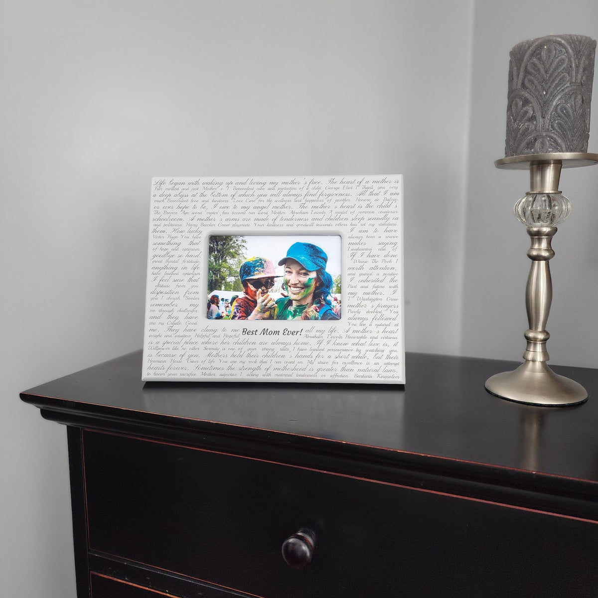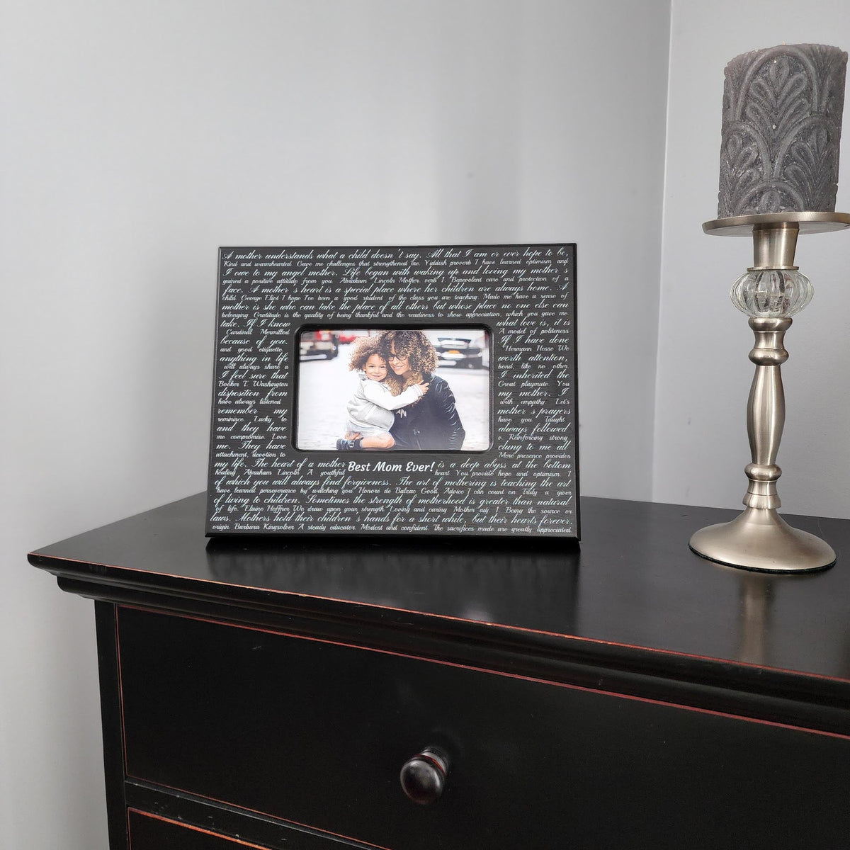 We surround your picture with all the things you want to say to Mom. Thanking her for a job well done, letting her know she is appreciated, and telling her she has helped mold you into a better human.  Mom can display this elegant gift where it will serve as a daily reminder of the love you share.